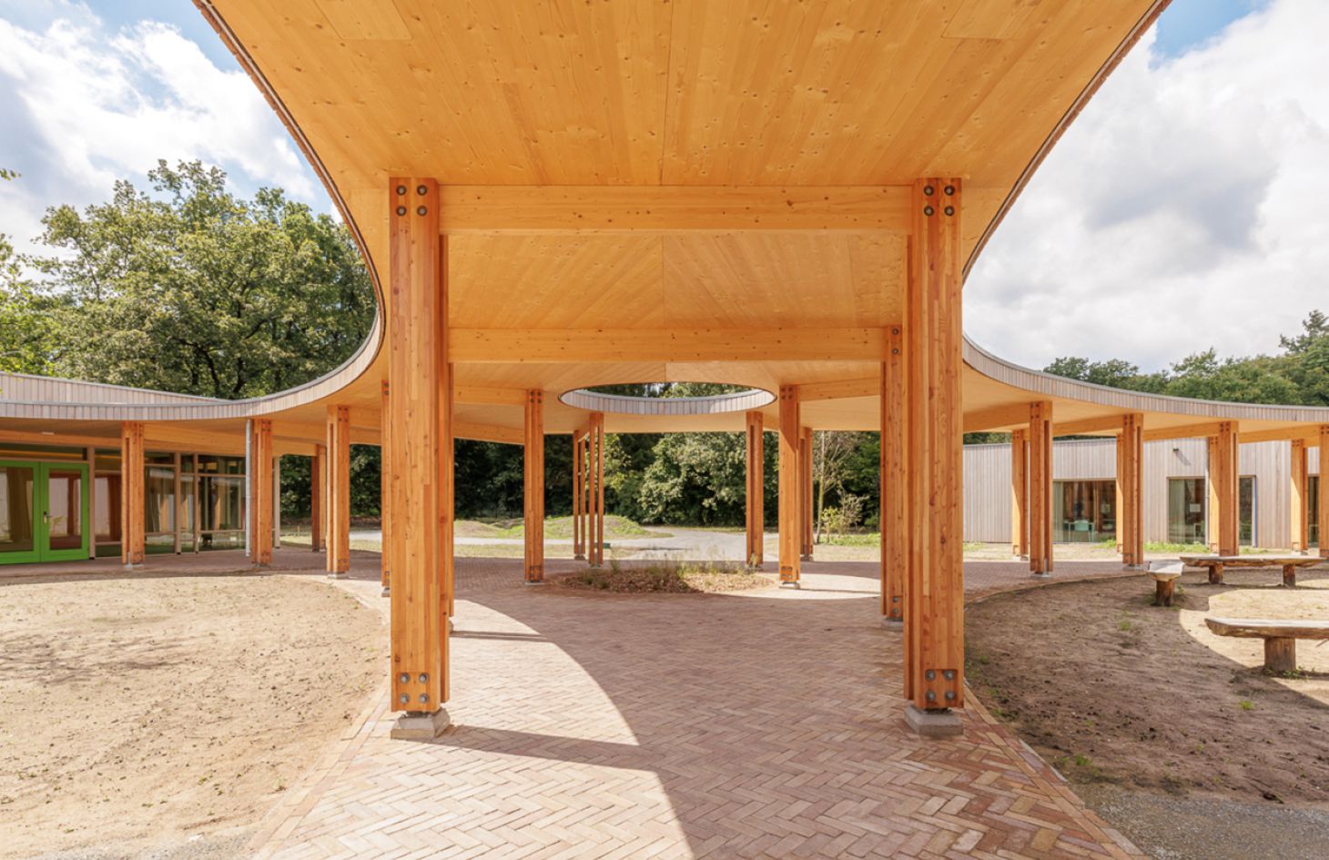 Hotel Heppie is met zorg en respect voor de natuur gebouwd. Het bestaat uit meerdere gebouwdelen, allemaal opgetrokken uit een dragend houten skelet. Deze zijn verbonden door een unieke houten luifel in de vorm van een driehoekige boemerang. Met gevels bekleed met maar liefst 23 kilometer houten geveldelen, duurzame installaties en groene daken, gaat het hotel perfect op in de omliggende bossen.