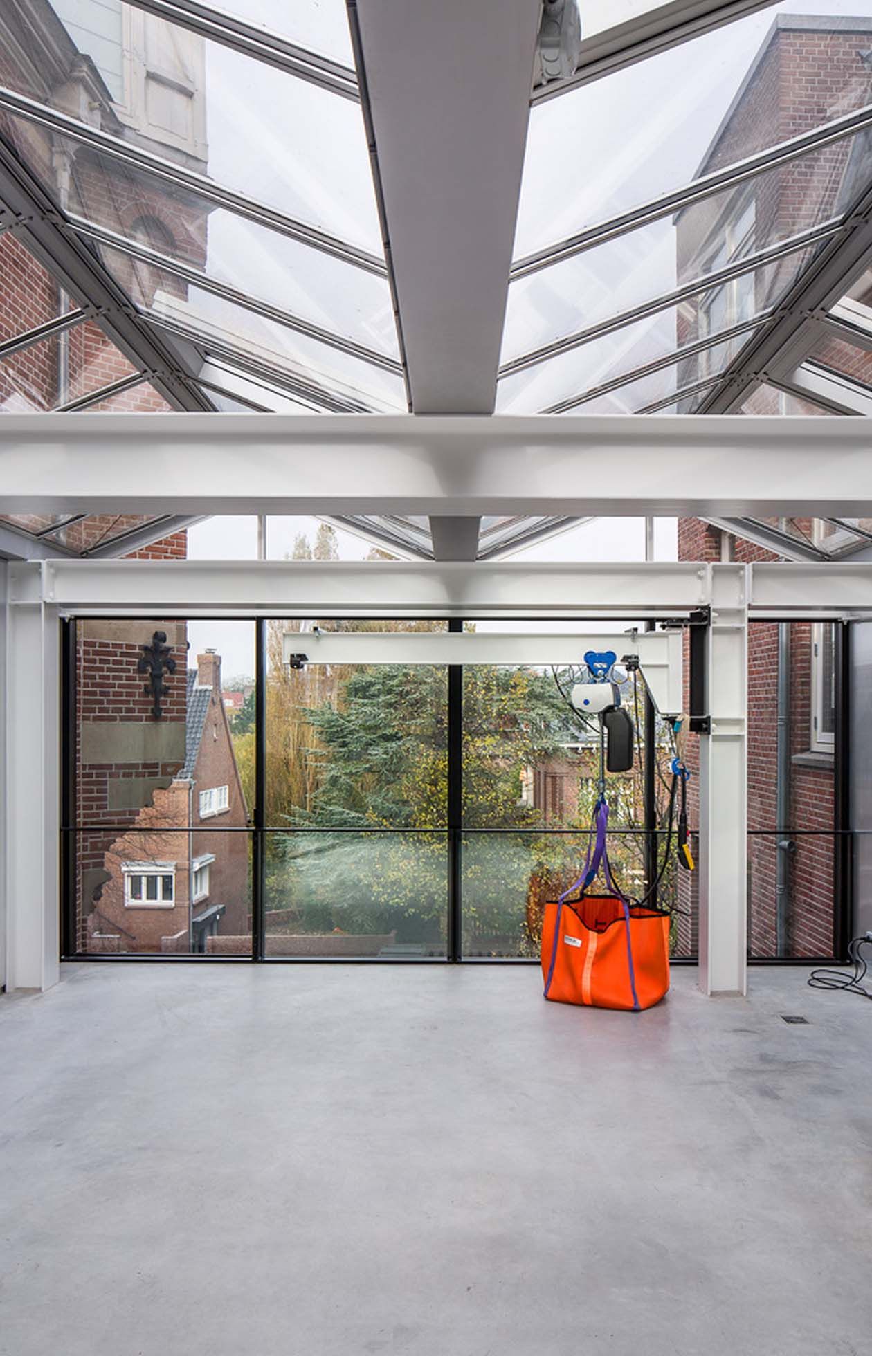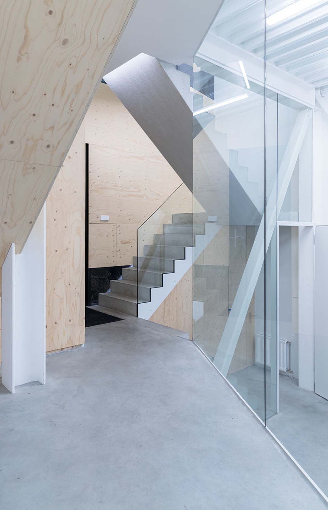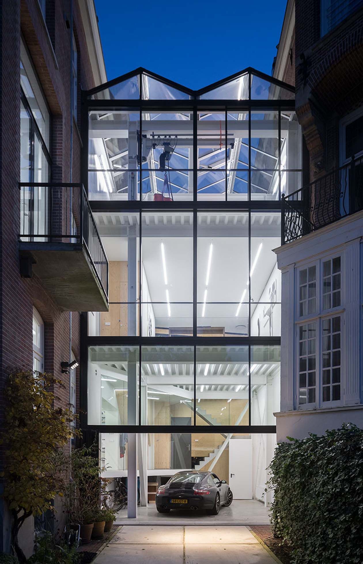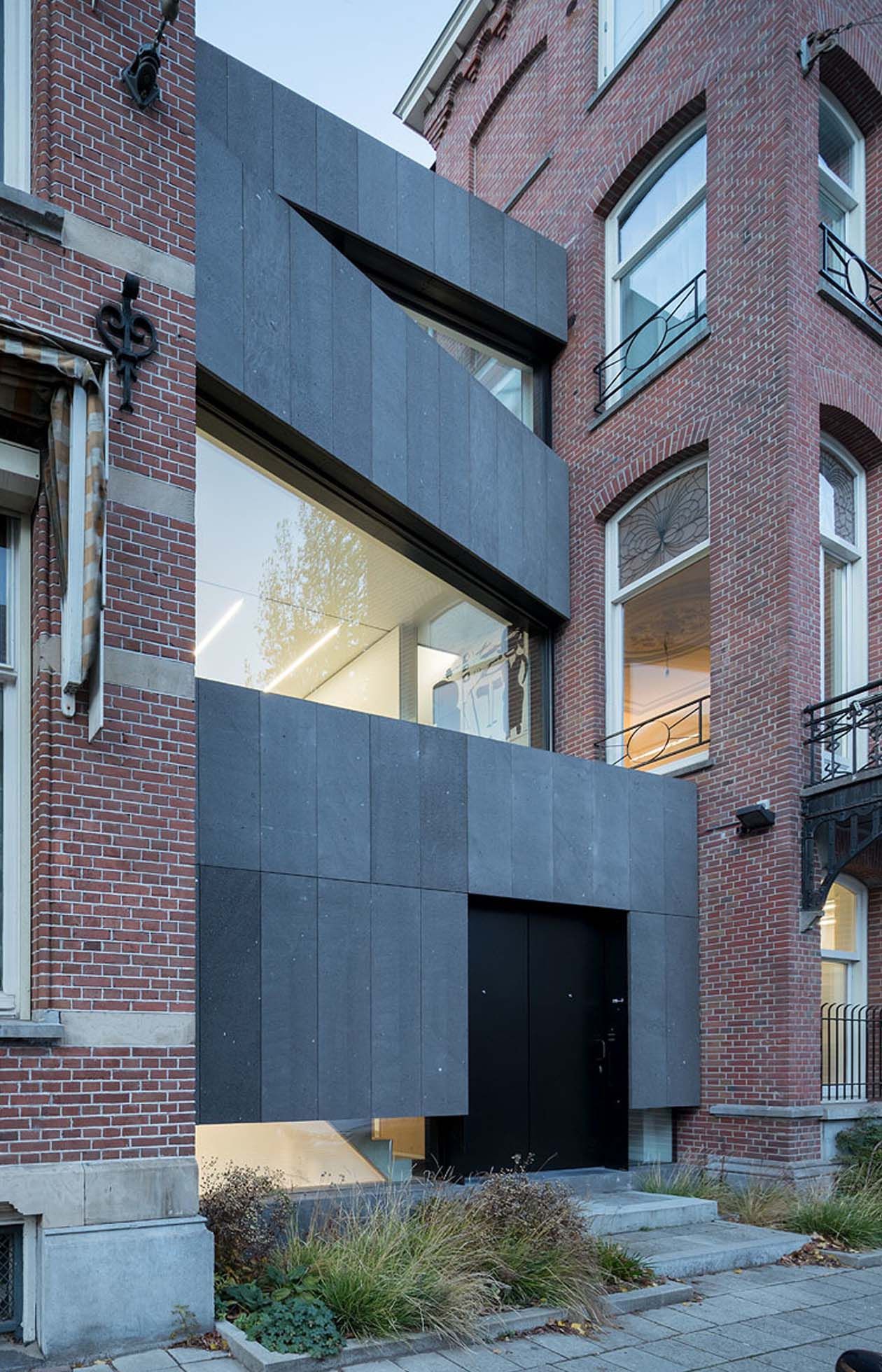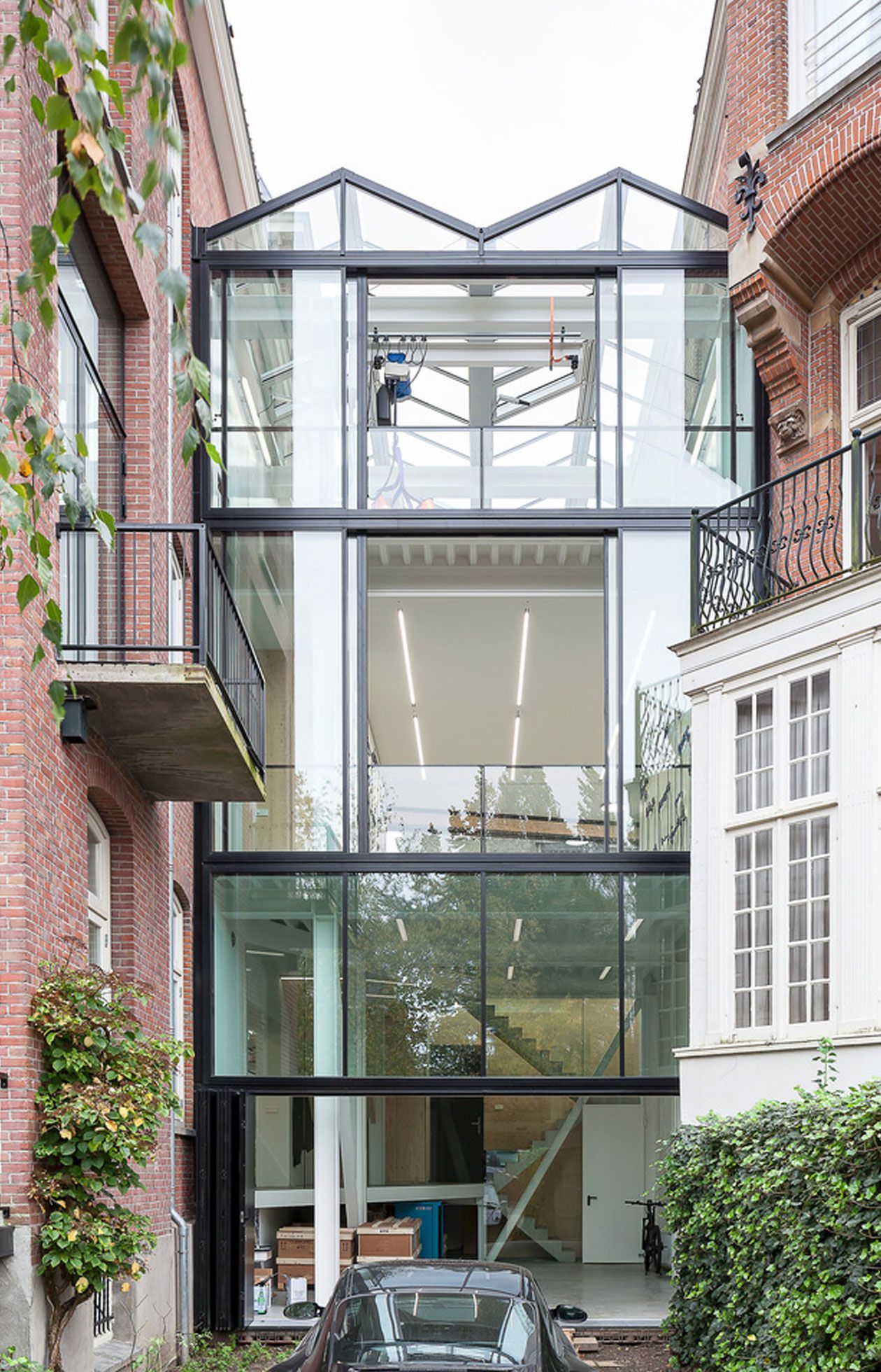 Gemaakt van glas, staal en basalt, contrasteert het gebouw op een subtiele manier met de buren. Gebouwd op het fundament van een voormalige garage is het gebouw EENWERK, een kunstruimte die per keer werk tentoonstelt en het kantoor waar ontwerpster Irma Boom werkt en de bibliotheek waar zij haar boekenverzameling heeft.